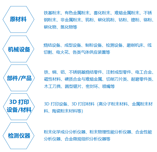 铁、铜、铝、不锈钢基烧结零件、注射成型零件、电工合金、磁性材料、硬质合金与难熔金属、陶瓷材料、超硬材料、摩擦材料、多孔材料、其他产品。