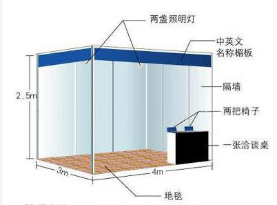 ②标准展台:中英文楣板.9平方米地毯.方桌1张.折椅2把.射灯2只.220V
