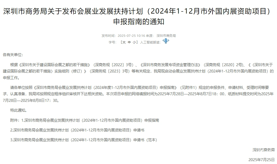 | 深圳市商务局发布会展业发展扶持计划(2024年1-12月市外国内展资助项目)申报指南