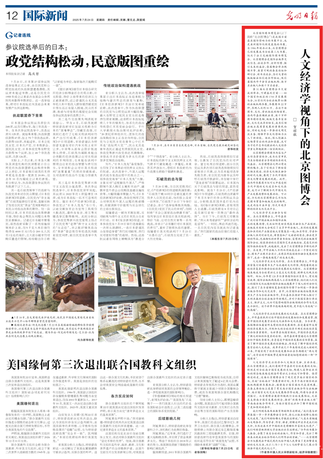 北京国际图书博览会(以下简称“北京图博会”)是我国目前最具国际影响力的书展平台,也是亚洲国际化程度最高的书展。自1986年创办以来,北京图博会已经发展成为全球第二大书展,仅次于法兰克福国际图书博览会。北京图博会是国际出版界交流信息、洽谈合作、分析形势、探讨未来的盛会,每届都会举办规模不等、数量可观的各类论坛和研讨会、新书座谈会,签订大量的版权输出和引进合作协议,吸引着国内外千余家出版机构、数万名出版人和数十万名读者。 第31届北京图博会不久前成功举办,可谓盛况空前——80个国家和地区的1700多家展商与会,30家位列全球出版界50强的出版机构参展,参展图书22万种,参观人次约30万。在这个由图书、文化、资讯组成的场馆里,海内外嘉宾踊跃出席,数十万种图书精彩亮相,版权交易丰富活跃,文化交流异彩纷呈,成为引领出版业高质量发展的重要风向标,同时也为进一步推动文明交流互鉴、增强中华文化影响力注入了新动能。由此,深入挖掘上述场景背后的内涵和意蕴,或可为习近平总书记提出的人文经济学重大命题提供一份实践例证。 北京图博会将图书内容与产业形态紧密结合,成为北京市民乃至全国读者分享阅读快乐的文化盛会。北京图博会之所以有这样的魅力,在于它顺应了供给需求相互促进、经济文化相互融合的时代大潮,展现了当代中国经济文化繁荣发展的风貌。此外,海内外参展商不仅可从中感受到当代中国的文化追求和文化品质,也可以了解到当代中国文化产业发展趋势和发展动向。可以说,今天的北京图博会已不仅仅是图书贸易和版权交流的场所,也是内容日益丰富、形式日趋多样的经济文化交流平台。 人文经济学关注融合与创新。在北京图博会上,中外嘉宾广泛讨论中国出版业和国际出版业的发展趋势,交流如何更好实现技术融合与产品创新。出版技术创新大会吸引了众多中外出版人,共同的发展困惑和共同的产业探索把大家聚集在一起;知名作家、学者和出版人共同对话交流,希望感知广大读者的需求,推出更多好的作品;充满趣味的世界童书论坛、富有洞见的出版教育国际会议、创意涌动的北京国际艺术出版论坛、灵感交织的国际插画论坛等,此起彼伏,发出了北京图博会多样化的声音。在这里,中外出版人不约而同地表达出一个坚定的信念:图书产业绝不会消亡,且将在科技创新和融合发展的加持下,走出一条越来越宽广的未来之路。 人文经济学关注文化价值。在北京图博会上,中外嘉宾密集讨论着图书生产与流通的文化价值,构想着促进全球经济复苏和推动全球经济发展的文化情怀。北京图博会越来越成为全球有识之士表达文化思想、阐释文化观点的场所。例如,今年有120多位重要国际组织负责人、有关国家政要、国际出版机构高层人士莅临图博会,他们就人们关心的国际文化议题和国际出版议题展开了深入的对话和交流,探讨了在当前错综复杂的国际形势下如何进一步推动出版合作和文化交流等。其中,北京国际出版论坛聚焦新质生产力与全球出版合作,多位嘉宾在演讲中深入探讨了互利共赢的全球出版合作新模式,并对少数国家推行单边主义、保护主义,从而可能影响国际出版领域的合作与交流表示担忧。这个世界不能越来越封闭,更不能人为筑起“小院高墙”。 人文经济学关注经济发展的文化底蕴。在北京图博会上,中外嘉宾热烈讨论中国经济的发展韧性和发展前景,探索中国经济发展背后的文化滋养和文化底蕴。当今世界,各国都面临着前所未有的经济发展困难、承受着前所未有的经济发展压力,不断加大的全球经济不确定性使经济复苏面临重重困难。与世界其他国家相比,中国经济表现出了强大的韧性和复苏的后劲。海外嘉宾希望通过北京图博会和中国优秀图书,亲身感受中国经济发展的实际景象,真实了解中国经济发展的经验做法,特别是了解中国经济现象背后的人文内涵。改革开放几十年来特别是进入新时代以来,中国实现了经济快速发展和社会长期稳定“两大奇迹”,这背后的中国故事是国际读者迫切想阅读的一部“中国图书”。 人文经济学关注经济和人文相互交融、互动共进。在北京图博会上,我们看到中外嘉宾对全球发展的关切,特别是对全球南方国家发展的关切,构建人类命运共同体的理念越来越受到海外有识之士的认可和赞誉。值得称道的是,这届北京图博会为了吸引更多南方国家的参与,实施“全球南方”参展资助计划,为多个南方国家的出版机构提供参展机会,邀请南方国家媒体代表团观展。在各主要论坛上设置了有关南方国家出版合作与出版融合、南方国家文化交流与发展路径等议题,约请与会者共同探讨。北京图博会秉持积极践行全球发展倡议,尤其是支持南方国家发展的理念,推动“丝路书香出版工程”等南南出版合作项目,为南方国家认识和了解中国创造了更加便利的条件。 我们听到马来西亚教育部副部长这样说:“我们愿与世界各国一步一步开展跨语言合作,持之以恒共创跨大陆的文化成果。”我们听到哈佛大学教授这样说:“人类本质相通而文明各异,作为学者、作家、译者,理解这种差异是我们的天职,当然这离不开中国的历史馈赠和丰富的文化遗产。”我们听到普林斯顿大学出版社社长这样说:“今年的书展令人振奋,会聚了来自全球的