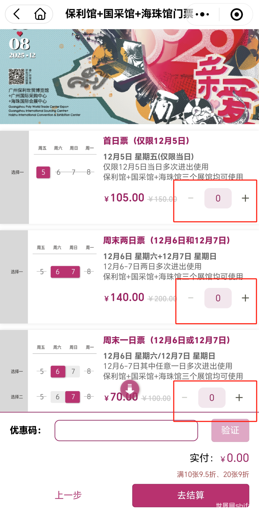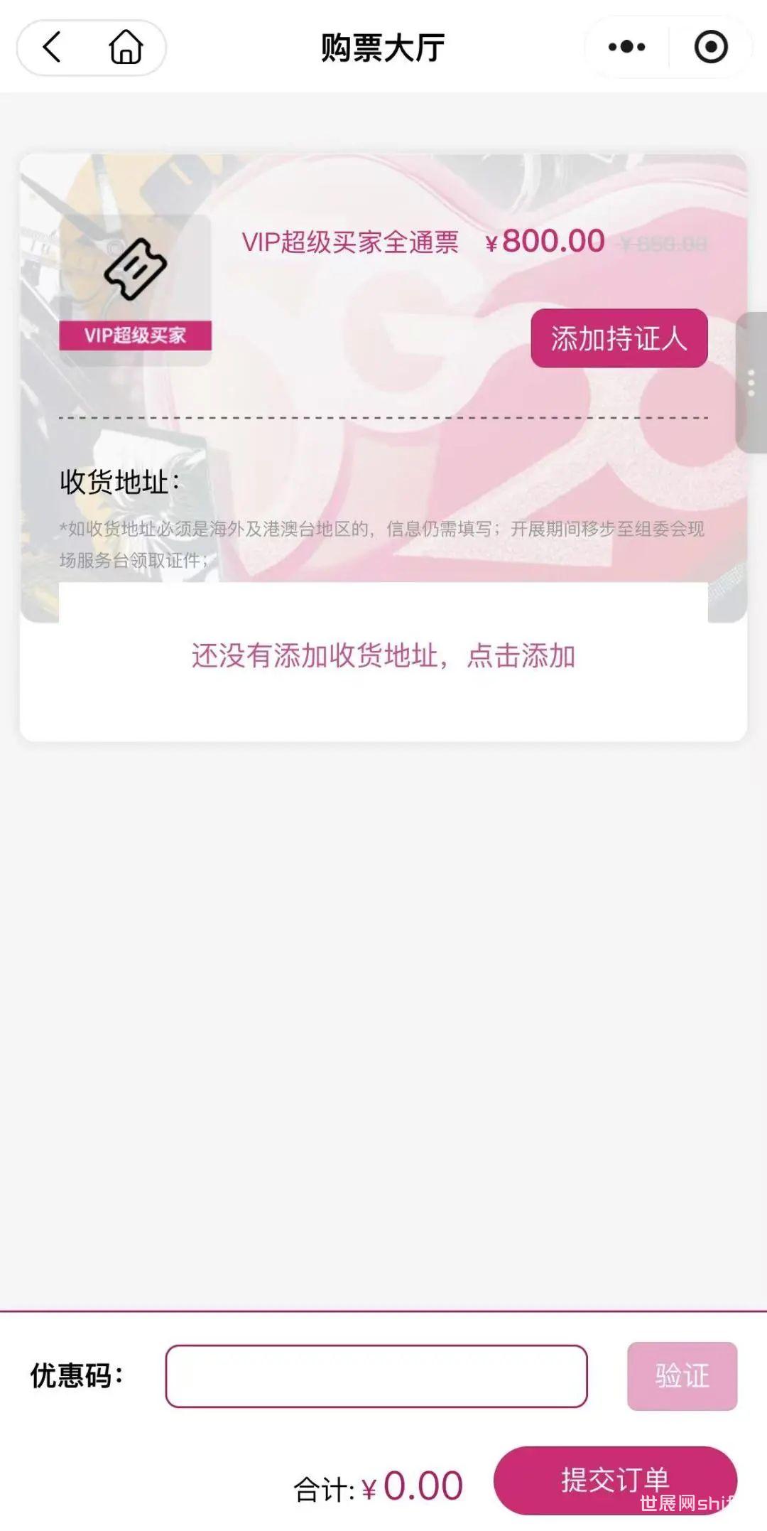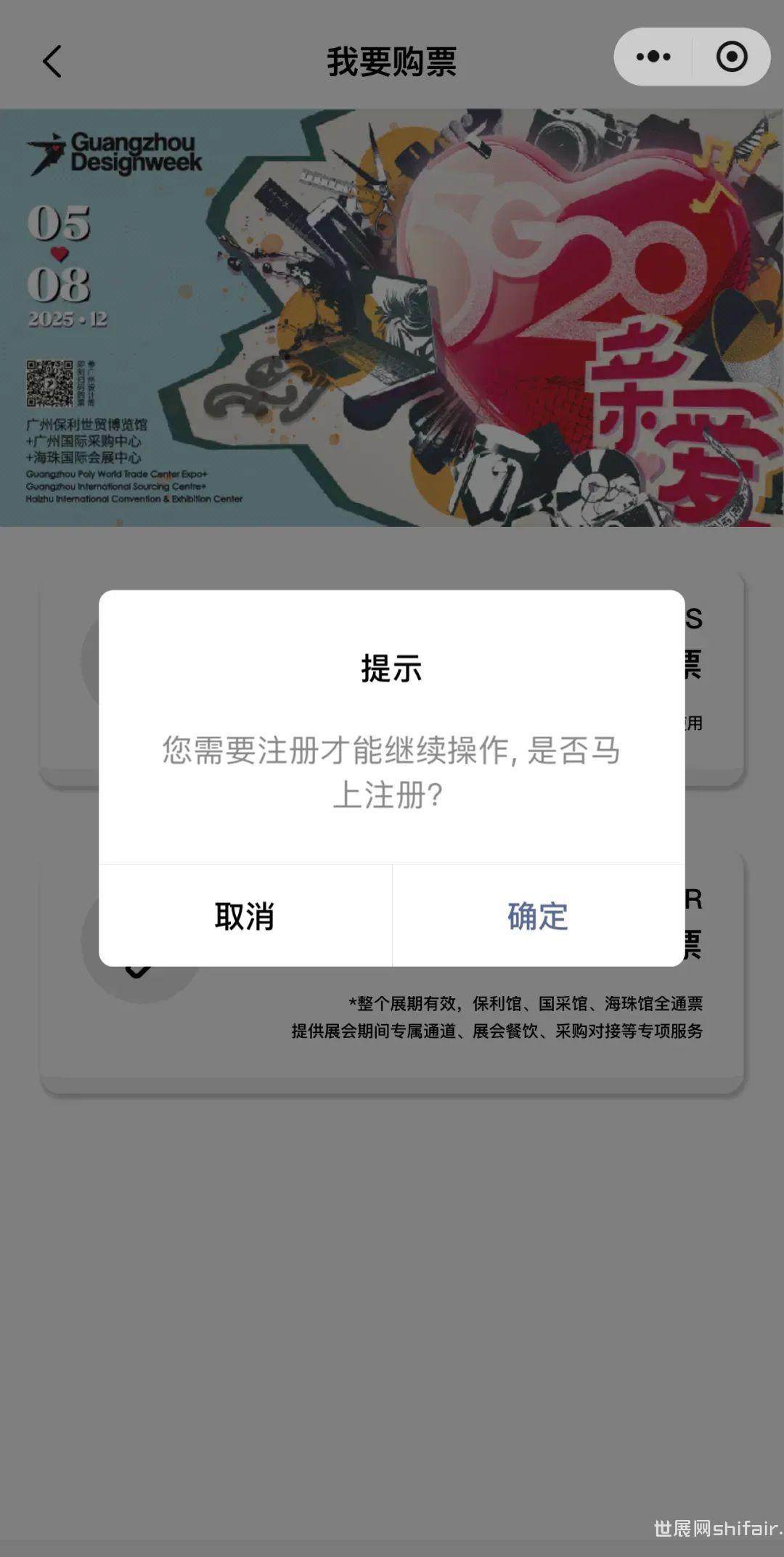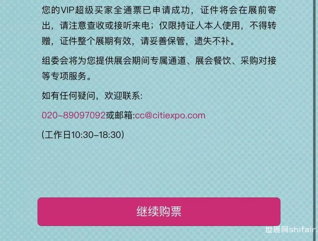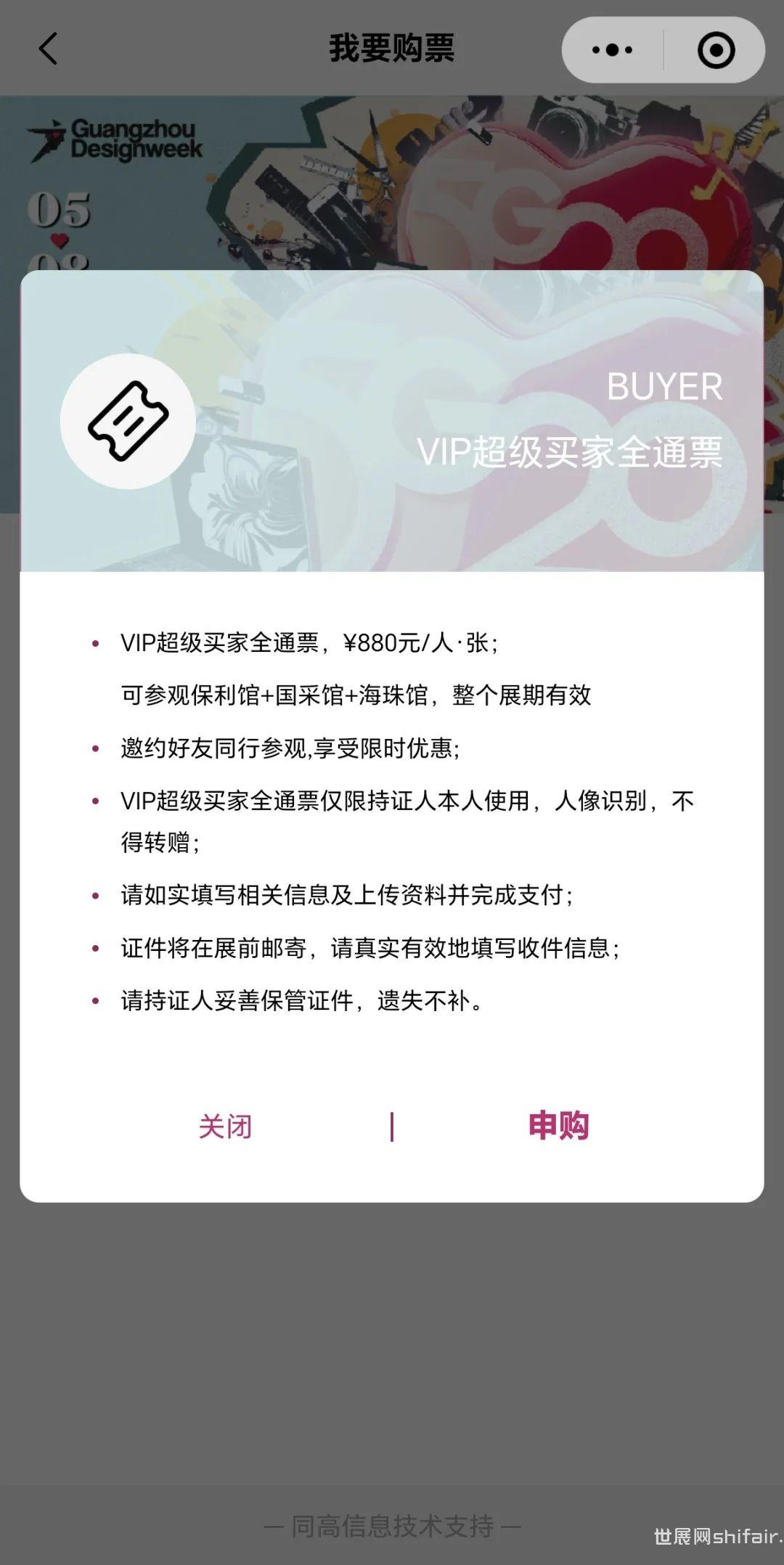 点击下方小程序,进入广州设计周购票通道; 点击“我要购票”,进入购票页面; 选择“保利馆+国采馆+海珠馆门票”; 如未注册,可点击确认,进入注册页面; 老用户无需重复注册,完成问卷,进入购票大厅进行购票; 手机号快捷登录:授权手机号直接登录; 短信验证码登录:输入手机号获取验证码登录,手机收到验证码后填入; 新用户注册/老用户信息自动匹配填入,勾选确认后进入下一步; 填写“问卷调查”(新老用户都需填写),完成预登记,注册完成; 进入“购票大厅”,选择场次(日期)和数量; *TIPS:所有场次满10张以上享受团购9.5折,20张或以上享受团购9折优惠。 确认无误后,点击支付; *TIPS:未支付订单只保留24小时,如不操作,超过 24小时系统自动取消订单。 支付成功,购票完成将有短信提示 ,建议展前一周提前激活门票; 点击“查看门票”可查看门票二维码,二维码为动态不可截图; *TIPS:门票激活后不可转赠。 可通过生成海报或转发小程序链接邀请好友注册; 2025年12月5-8日,欢迎回家! ● 2025VIP超级买家票价有折扣 ①续订,全年可享100元优惠; ②新购,10月30日前可限时享受80元优惠; *12月5-8日整个展期四天均可使用,三馆全通,并配有专属通道、展会餐饮、采购对接等。 选择“VIP超级买家全通票”票种; 购买说明已阅后,点击“申购”; 点击“添加持证人”,选择“为自己购买”或者“为他人购买”; *TIPS:为自己购买的,默认自动导入注册信息,可根据需要自行修改;为他人购买的,需要准确填写对方信息。 填写基本采购需求,并上传个人证件照和公司营业执照; 点击“新增地址”按钮,正确完整填写信息并提交; *TIPS: ①帮他人购买,寄送另一个地址,可选择再次“新增地址”; ②港澳台及海外地区,地址信息仍需填写;但实体证现场领取,不做邮寄。 确认所有以上所填信息无误后,点击“提交订单”; *TIPS:确认支付后,以上所有信息均不可做修改。 如需再次购买,点击下方“继续购票”;重复一遍以上操作即可。 *TIPS: ①VIP超级买家全通票购票成功后不显示二维码,门票均为实体票,待组委会11月中下旬按照提交地址寄出; ②购VIP超级买家全通票默认已激活,无需再手动激活; ③已购VIP超级买家全通票的账号无法再激活其它普通门票(首日票、周末两日票、周末一日票、尾日票)。 展会针对专业人士开放,凭证件入场,为避免现场排队购票耗时长,请提前购票。 (*以下三种方式任选其一) ● 广州设计周官方网站 “观众通道” ● 广州设计周微信公众号 广州设计周“购票通道” ● 广州设计周小程序 可扫葵花码进入“广州设计周GZDW”小程序 ● 团体观众购票参观 同事好友太多,想一起来参会?10人以上一次订单搞定,请联系: 广州设计周组委会 赵女士 920 *参团人数越多,享受折扣越大! ● 海外观众购票参观 如果你是海外观众,请联系: 广州设计周组委会 邓女士 097 Ticket-purchasing, foreign visitors please contact: Ms. Siya Deng | 097 GZDW