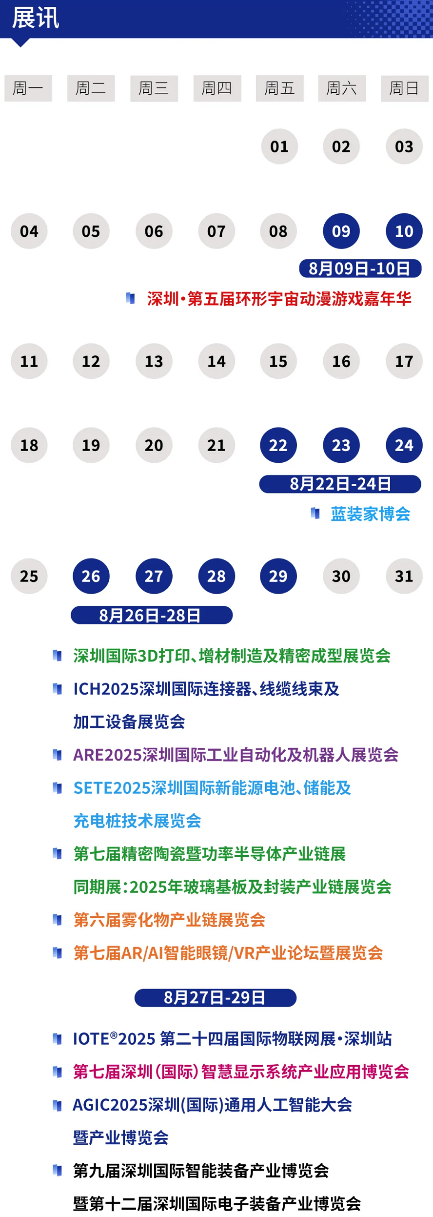 8月26日至28日,深圳3D打印及增材制造展将亮相,展示材料、设备、后处理、终端应用的完整生态链;ICH 2025深圳连接器与线束加工设备展聚焦汽车、电子等核心部件技术。