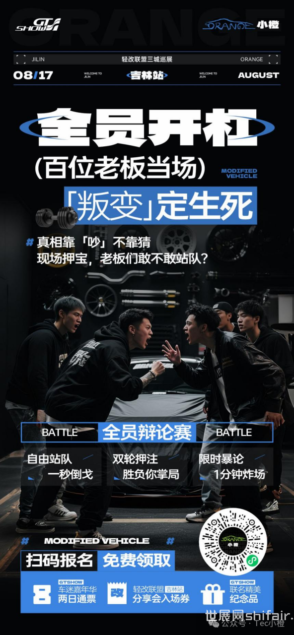 不是参观,是参与|GT Show轻改联盟交流会·吉林站 改装门店经营越来越难,不是错觉,而是现实。 流量焦虑、团队难管、项目难卖…… 到底怎么破?在吉林,这些问题将被搬上台面。 这不是走场子、不是听宣讲—— 是一场改装圈自己开的闭门会。 GT Show 轻改联盟交流会·吉林站,三个核心环节,全场真实交锋。 圈内人,讲圈内事。 8月17日,吉林朱雀赛车场,东北改装圈迎来一次真正的行业聚会。 由GT Show 联合小橙发起的【轻改联盟三城巡展】首站正式落地吉林。我们将邀请200+优质门店老板、头部大咖、行业从业者,围绕真实的经营难题和改装趋势展开深入碰撞。 三大重磅互动环节,精彩一触即发: 01|全员辩论赛:观点对决,立场自由切换! 热点辩题,现场揭晓! 老板们自由站队、激烈开杠、两轮投票,看看谁的观点能说服全场? 不仅有话语权,还有“掌局权”! 02|门店逃生舱:突围演练,拼的是解决力! 面对“业绩下滑、人心涣散”等真实难题,每人手握一张技能卡,限时提出破解方案,现场投票评选最强打法! 03|快问快答挑战:脑速挑战,干货输出! 三大奖项现场揭晓: 年度创新突破改装门店 年度最佳特色改装门店 年度人气改装门店 优秀门店将获得【官方定制奖杯 + 联合官宣曝光】 活动信息: 时间:2025年8月17日(星期日)14:00 地点:吉林朱雀国际赛车公园气膜馆 报名方式:扫码填写报名表,免费参与轻改联盟交流会 所有参会门店可获: GT Show车迷嘉年华吉林市站门票 门店奖项申报资格 精美定制礼品一份 本场活动为轻改联盟三城巡展首站后续将落地广州、合肥,覆盖华南、华中改装核心圈层,联合释放汽后圈层势能,敬请期待! 部分到场嘉宾: 下场活动预告: